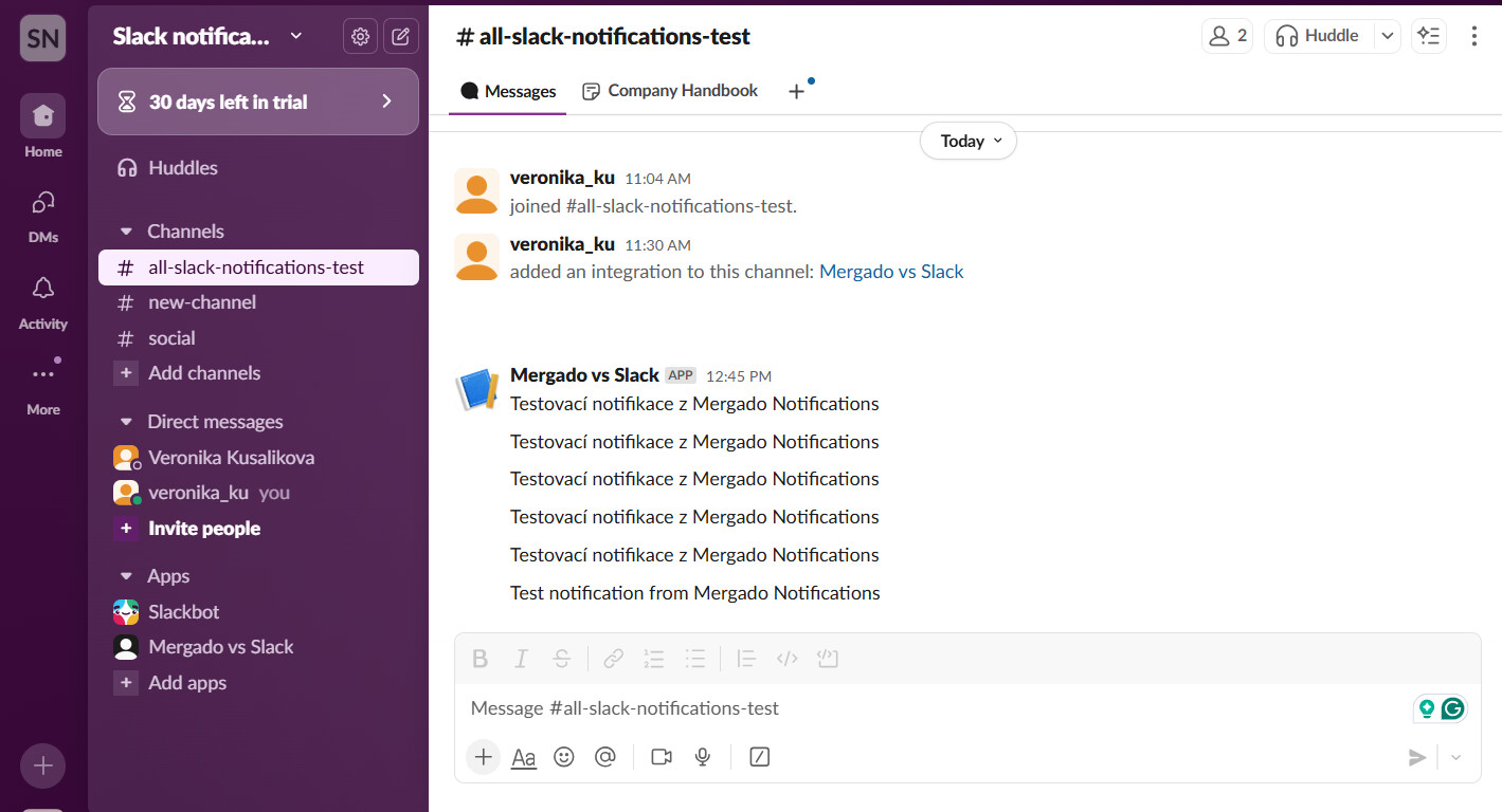 Aplikace funguje na úrovni uživatelského účtu – upozornění, která jsou běžně dostupná v notifikačním centru Mergada, aplikace zašle do soukromé zprávy či sdíleného vlákna ve vaší komunikační platformě. Pozor, v současnosti umí rozšíření zasílat pouze notifikace, které chodí z jiných rozšíření (aplikací). Brzy zprovozníme verzi, která již bude umět veškerá upozornění z Mergado Editoru.
