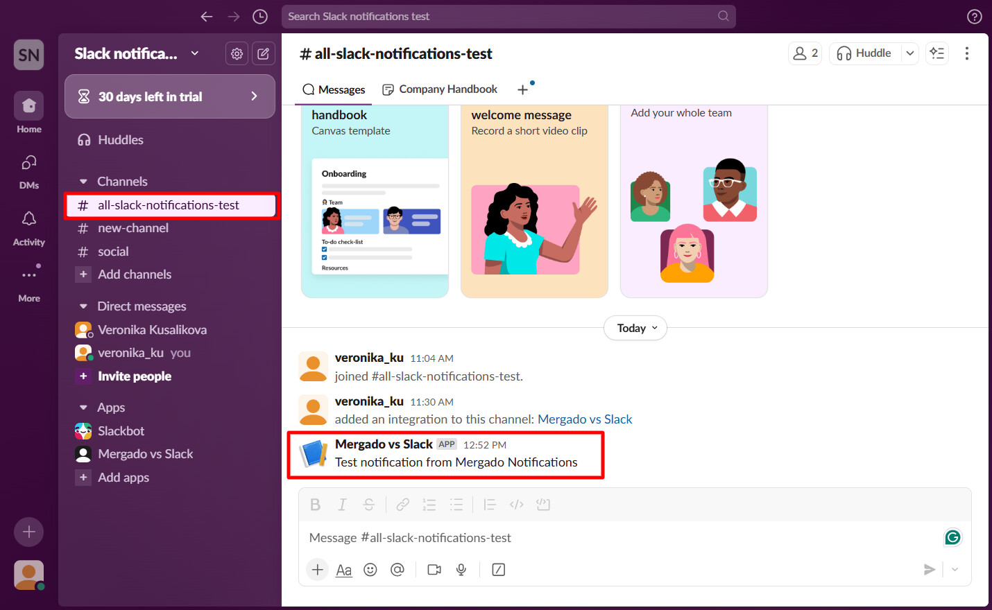 The application works at the user account level – notifications that are normally available in the Mergado notification center are sent by the application to a private message or shared thread in your communication platform. Please note that currently, the extension can only send notifications that come from other extensions (applications). We will soon launch a version that will be able to handle all notifications from Mergado Editor.